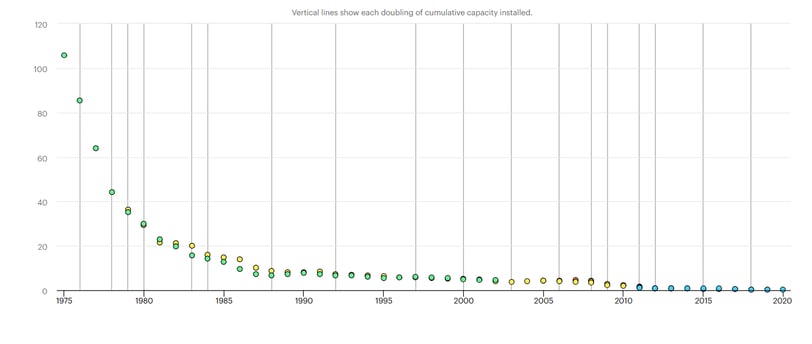 Over the past 50 years, the prices of PV modules have dramatically fallen by around 99%, with costs dropping from approximately $100 per watt in the 1970s to as low as $0.20 to $0.30 per watt today. Almost in sync, during the past decade, the cost (for storing each ampere-hour of charge) of batteries has fallen by more than 90%.